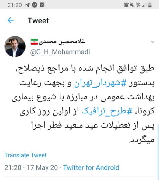 به گزارش خبرگزاری فارس غلامحسین محمدی مشاور شهردار تهران در پستی توئیتری نوشت: توافق انجام شده با مراجع ذی صلاح به دستور شهردار تهران و به جهت رعایت بهداشت عمومی در مبارزه با شیوع بیماری کرونا طرح ترافیک از اولین روز کاری پس از تعطیلات عید سعید فطر اجرا می شود.