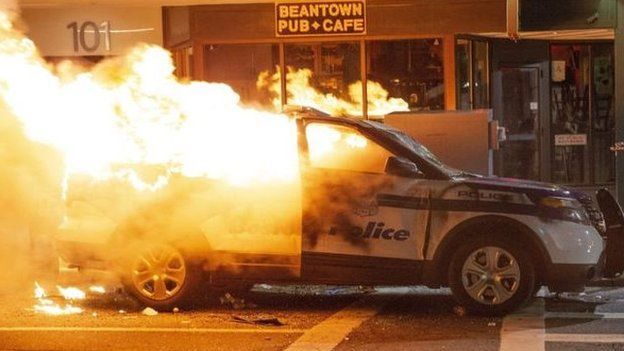 آتش زدن خودروی پلیس از سوی معترضان در شهر بوستون/ EPA