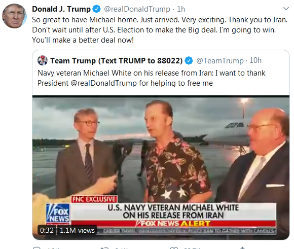 ترامپ چند ساعت بعد در توییتی دیگر درباره تمایلش به مذاکره با ایران صریحتر سخن گفت و نوشت:" خیلی خوب و هیجانانگیز است که ما مایکل را در خانهمان داریم. از ایران تشکر میکنم. برای توافق جدید تا انتخابات آمریکا صبر نکنید! من برنده خواهم شد. اکنون میتوانید توافق بهتری داشته باشید!