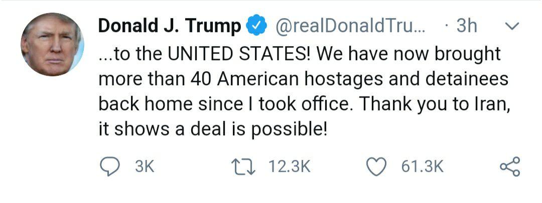 او ابتدا دیروز در توییتی نوشت:" از زمانی که من سر کار آمدهام، ما بیش از ۴۰ گروگان و زندانی آمریکایی را به خانه آوردهایم. از ایران ممنونم؛ این نشان داد که توافق ممکن است!"