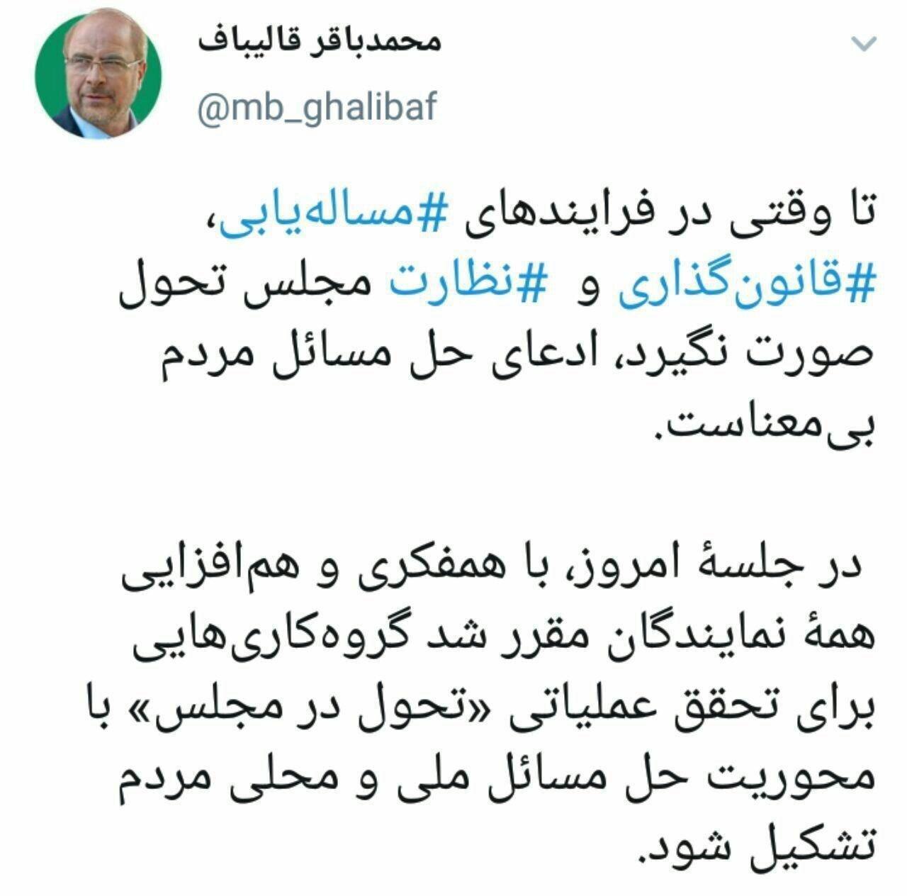 قالیباف: تا وقتی در فرآیندهای مجلس تحول صورت نگیرد، ادعای حل مسائل مردم بی‌معناست