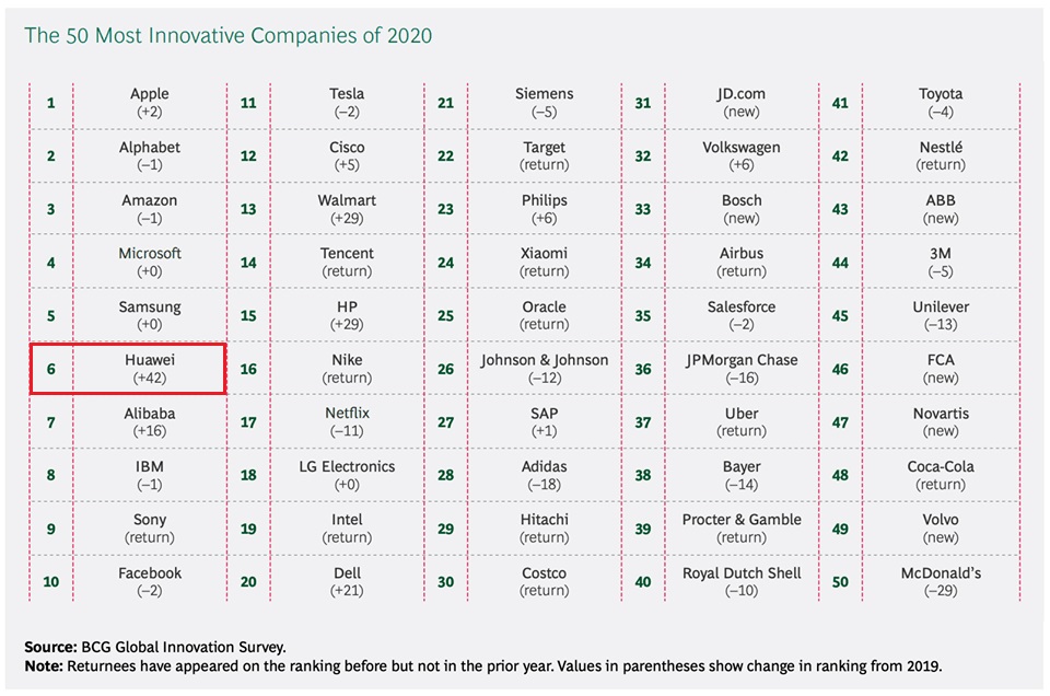 شرکت هوآوی از سال 2014 تاکنون در لیست ۵۰ شرکت نوآور از نگاه BCG رتبه داشته است، اما این نخستین بار است که این شرکت موفق شده به جایگاه ۱۰ شرکت نخست راه پیدا کند.