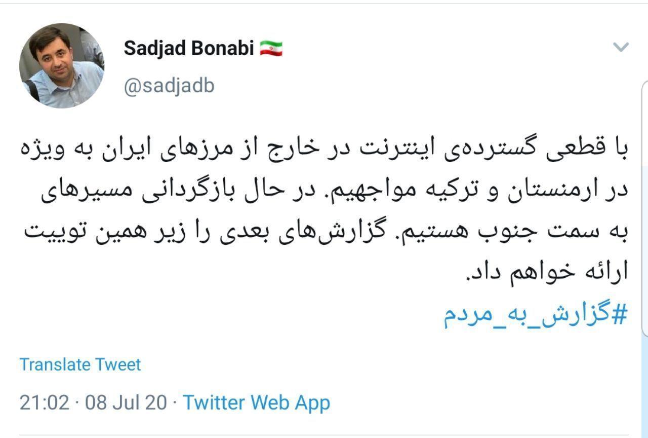 «سجاد بنابی» در توییتر خود نوشت: با قطعی گسترده اینترنت در خارج از مرزهای ایران به ویژه در ارمنستان و ترکیه مواجهیم.