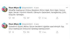 علی اف در صفحه تویتری خود در این ارتباط نوشت : ارتش جمهوری آذربایجان ۱۳ روستای در شهرستان های " زنگیلان " ، " قبادلی " ، " فضولی " و " جبرایل " در قره باغ آزاد کرد .
