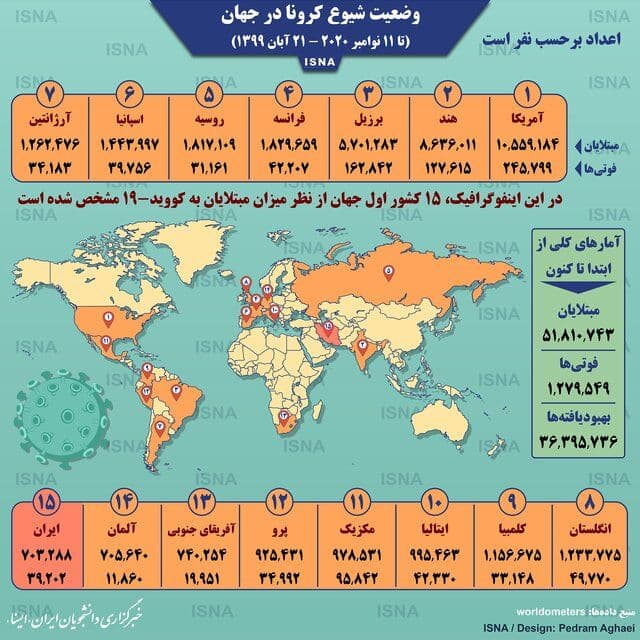 آمار کرونا در جهان تا ۲۱ آبان (اینفوگرافیک)