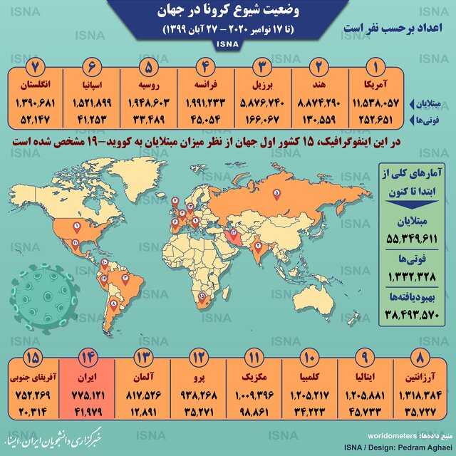 تعداد مبتلایان به ویروس کرونا در جهان، تا صبح سهشنبه (۲۷ آبان) از مرز ۵۵ میلیون نفر عبور کرده است و تعداد قربانیان این ویروس نیز از مرز یک میلیون و ۳۳۲ هزار نفر فراتر رفت.