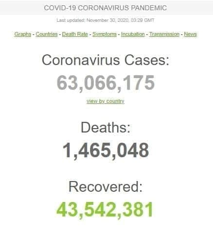 تعداد مبتلایان به ویروس کرونا در جهان به 63 میلیون و 66 هزار و 175 نفر رسید یک میلیون و 465 هزار و 48 نفر جان باخته و 43 میلیون و 542 هزار و 381 نفر بهبود پیدا کرده اند.