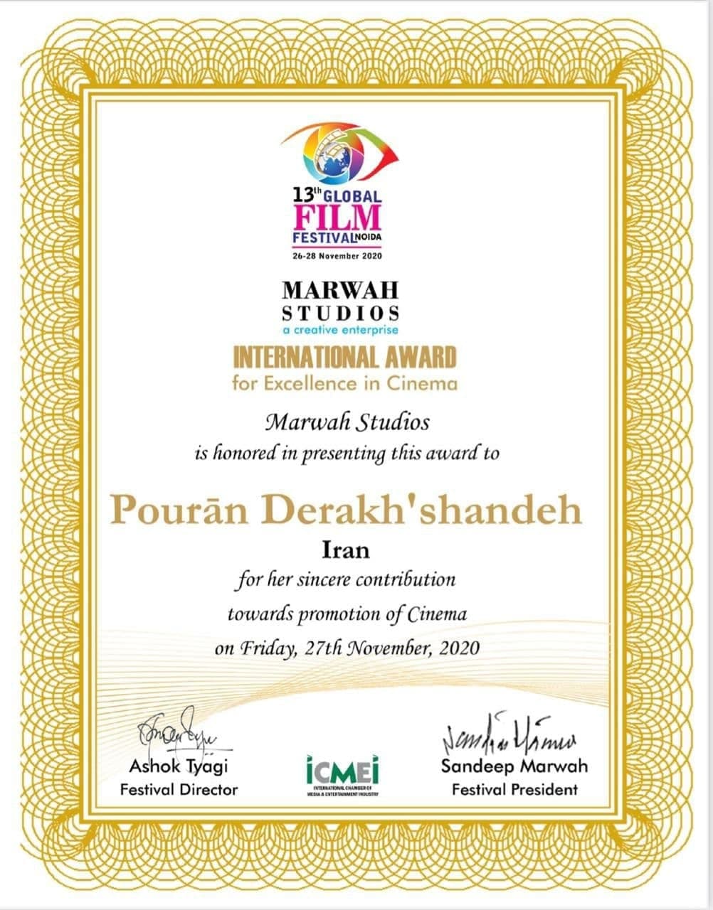 سیزدهمین دوره جشنواره بینالمللی فیلم «گلوبال» Global با آثار کارگردان 80 کشور جهان؛ در روزهای 6 تا 8 آذر ماه جاری (26 تا 28 نوامبر 2020) به صورت آنلاین در کشور هندوستان برگزار شد و پوران درخشنده کارگردان باتجربه و سرشناس سینمای ایران که با تمام آثار سینمایاش به نمایندگی از سینمای ایران در این رویداد سینمایی حضور داشت؛ به دلیل تلاشهای صادقانه در طی سالهای مداوم کار در حوزه سینما و در ارتباط با مردم؛ جایزه این دوره جشنواره را از آن خود کرد.