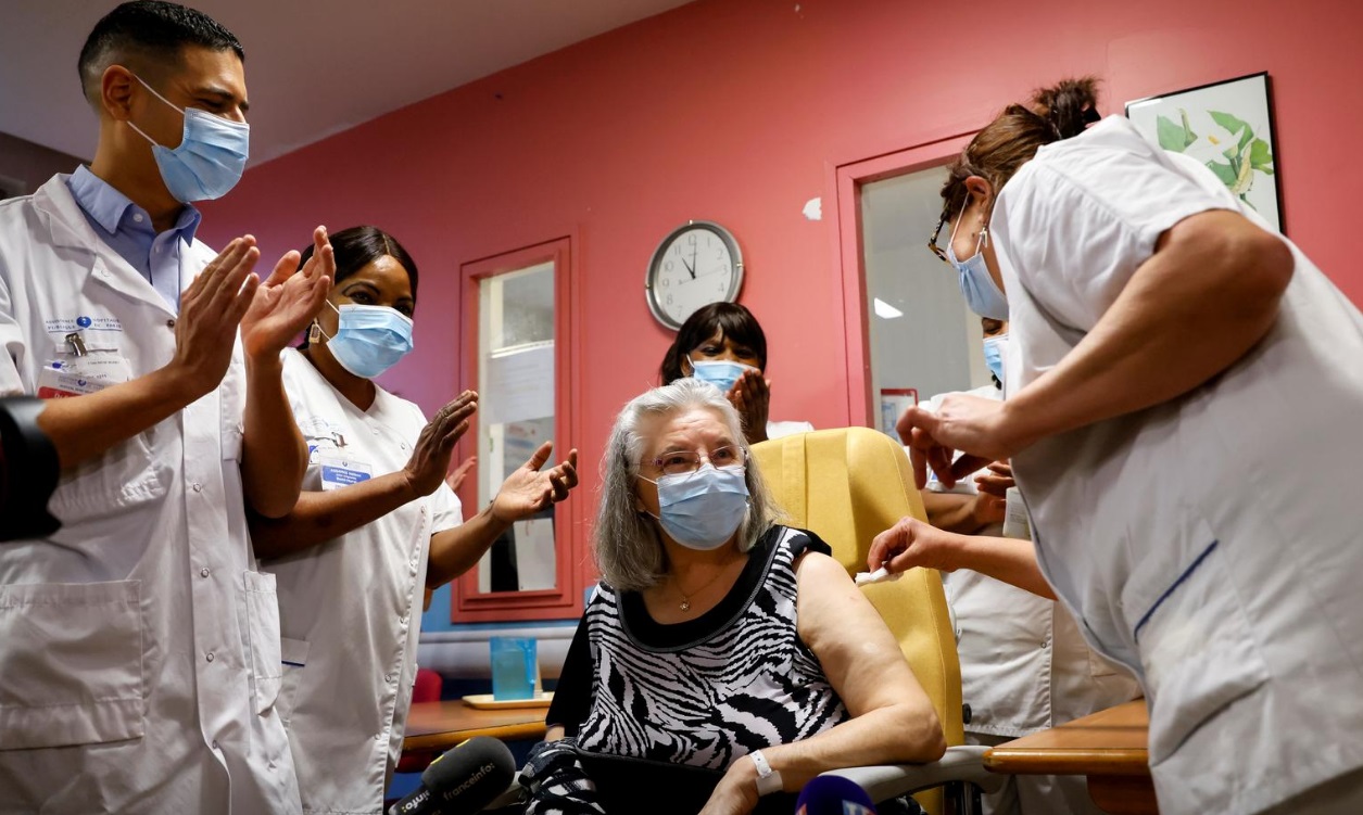 کادر بهداشت و درمان بیمارستان "رنه- مورت" در شهر "سوران"، زن فرانسوی 78 ساله را پس از دریافت اولین دوز واکسن "فایزر- بیونتک" تحسین میکنند/ عکس: رویترز- POOL
