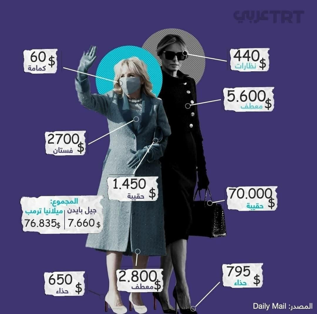 در این تصویر مقایسه قیمت لباس های همسران ترامپ و بایدن را می‌بینید. به گزارش اقتصاد24، ملانیا ترامپ: ۷۶ هزار و ۳۵۰ دلار وجیل بایدن: ۷ هزار و ۶۶۰ دلار برای لباس هایشان هزینه کرده اند.