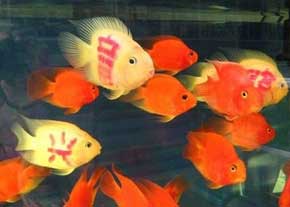 ماهي‌هاي زينتي كه بر روي بدنشان عباراتي نظير «خوش شانسي»، «شانس و بخت»، «زندگي طولاني» و «شادماني‌» حك شده باشد، تا 120 يوآن فروخته مي‌شوند.