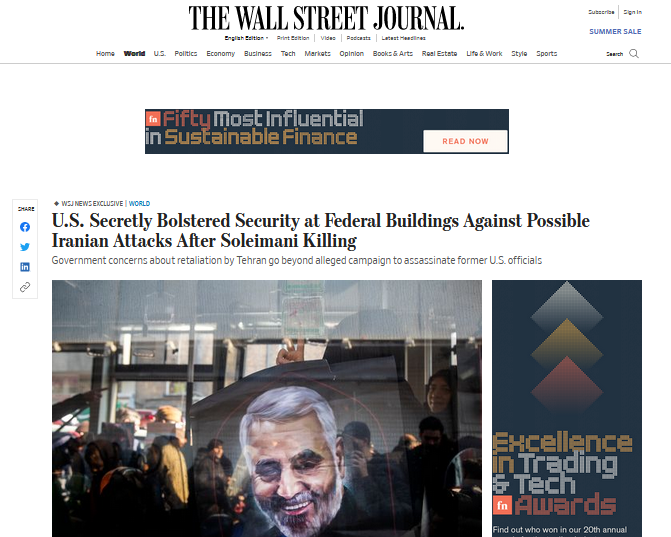 روزنامه وال استریت ژورنال ادامه داد دولت امریکا اقدامات امنیتی در هزاران ساختمان های فدرال (ملی) را تقویت کرد تا با انتقام احتمالی از سوی ایران مقابله شود.