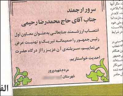 آنگونه كه از آگهی منتشر شده در یك روزنامه سراسری‌ بر می‌آید، "مردم" یك شهرستان با هم به معاون اول رییس‌جمهور تبریك گفته‌اند.