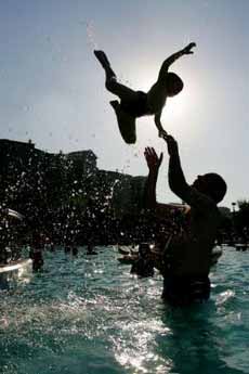 گرماي بيش از حد هوا، يک پدر چيني در حال بازي با پسرش در آب