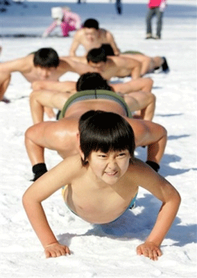 تمرین کودکان کره جنوبی با نظامیان در سرما