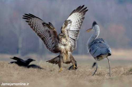 صحنه‌اي نادر از مبارزه‌جويي يك شاهين و يك مرغ ماهي‌خوار بر سر قلمرو در ناحيه دوب در فرانسه و در حالي كه يك كلاغ سياه شاهد صحنه است.
